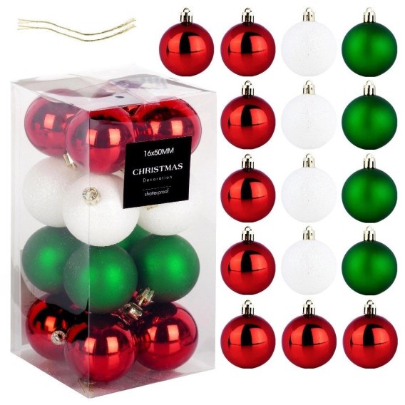 Zestaw 16 sztuk nietłukących bombek. W zestawie: 8x czerwone bombki błyszczące, 4x zielone bombki matowe, 4x białe bombki brokatowe. Bombki prezentują się bardzo efektownie. Niezbędne do dekoracji choinek, kompozycji świątecznych i stroików. Będą stanowić wyjątkową ozdobę na choince. Z ich pomocą możemy w modnym stylu ubrać swoje drzewko świąteczne.