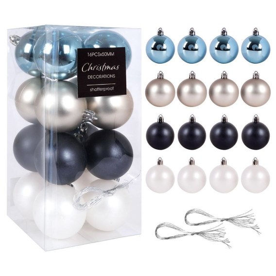 - ŚWIĄTECZNE - Zestaw 16 sztuk bombek wraz ze sznureczkiem do zawieszenia. Każda z bombek ma średnicę 5 cm. W zestawie bombki w kolorze białym, srebrnym, niebieskim i granatowym w wersji błyszczącej oraz matowej.