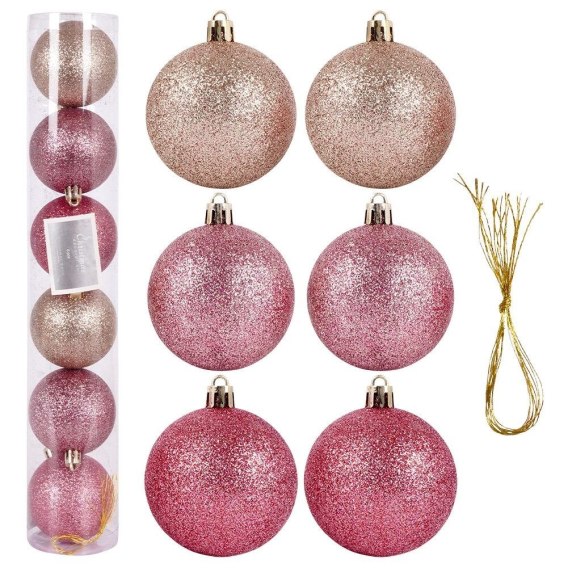 - ŚWIĄTECZNE - Zestaw 6 sztuk bombek wraz ze sznureczkiem do zawieszenia. Każda z bombek ma średnicę 6 cm. W zestawie bombki w trzech odcieniach różu w wersji brokatowej.