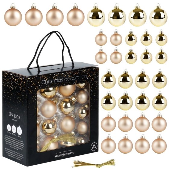 Zestaw 34 sztuk szklanych bombek. W zestawie: 10x bombki o średnicy 4 cm (4x matowe, 6x błyszczące), 16x bombki o średnicy 5 cm (8x błyszczące, 8x matowe), 8x bombki o średnicy 6 cm (4x matowe, 4x błyszczące). Bombki prezentują się bardzo efektownie. Niezbędne do dekoracji choinek, kompozycji świątecznych i stroików. Będą stanowić wyjątkową ozdobę na choince. Z ich pomocą możemy w modnym stylu ubrać swoje drzewko świąteczne.