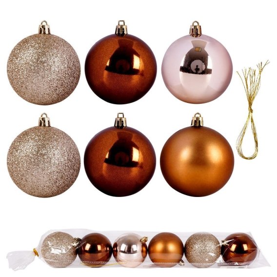 - ŚWIĄTECZNE - Zestaw 6 sztuk bombek wraz ze sznureczkiem do zawieszenia. Każda z bombek ma średnicę 7 cm. W zestawie bombki w kolorze perłowym i bursztynowym w wersji błyszczącej, brokatowej oraz matowej.