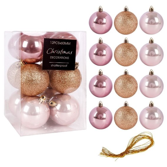 - ŚWIĄTECZNE - Zestaw 12 sztuk bombek wraz ze sznureczkiem do zawieszenia. Każda z bombek ma średnicę 6 cm. W zestawie bombki w kolorze różowym w wersji błyszczącej, brokatowej oraz matowej.