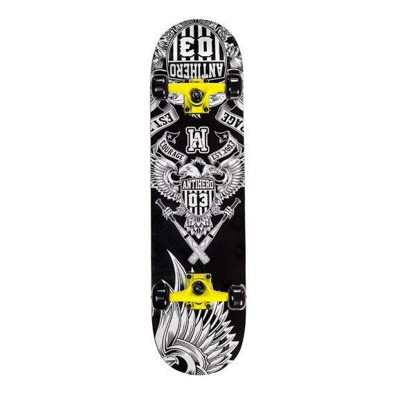 CR3108SA Antihero Nils Extreme to deskorolka o interesującym designie. Jej powierzchnię pokryto stalowo-czarną grafiką. Deck jest specjalnie wzmocniony, profilowany oraz polerowany. Deskorolka została wykonana z 9-warstwowej laminowanej sklejki. Materiał gwarantuje dużą wytrzymałość połączoną z elastycznością. Jej górna część pokryto papierem ściernym (tak zwany grip). Wykorzystanie tego materiału powoduje zwiększenie przyczepności nóg. CR3108SA posiada kółka PU Black 54x36 mm, charakteryzujące się doskonałą szybkością. Podobnie łożyska klasy ABEC-5, które posiadają bardzo dobre właściwości jezdne.