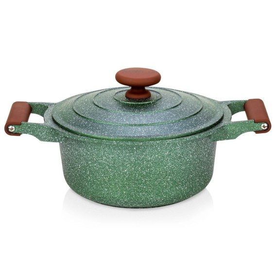 Nieprzywierający garnek o wyjątkowym, ponadczasowym wyglądzie. Garnek ma piękny ciemnozielony kolor, oraz brązowe wstawki, dzięki czemu efektownie prezentuje się w kuchni. Garnek sprawdzi się do gotowania oraz duszenia, przygotujemy w nim różnego rodzaju dania, zupy czy sosy. Efektownie prezentuje się w kuchni oraz podczas serwowania dań bezpośrednio na stole. Oryginalny produkt greckiej marki NAVA z linii naczyń Omega. Wyprodukowano zgodnie z europejskimi standardami.