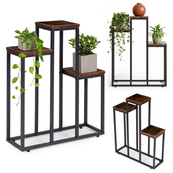 Stojak na kwiaty został wykonany ze stali malowanej proszkowo, co zapewnia odporność na korozję oraz uszkodzenia mechaniczne. Półki z płyty wiórowej wykończono w kolorze imitującym naturalne drewno, co podkreśla dekoracyjny, loftowy charakter mebla.