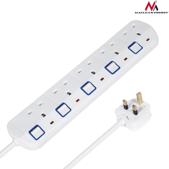 Listwa zasilająca Maclean MCE205 przedłużacz 5 gniazd, z włącznikami, wersja UK, 250VAC/10A, 1,5m, biała