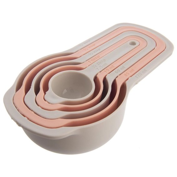 Zestaw pięciu miarek kuchennych do odmierzania. Pozwolą na łatwe i precyzyjne odmierzenie potrzebnej ilości składników podczas przygotowywania dań, przekąsek czy deserów. Przydatne w każdej kuchni. Wykonane z materiałów bezpiecznych dla zdrowia i neutralnych dla żywności.