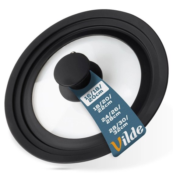Pokrywka wykonana jest z hartowanego szkła odpornego na wysokie temperatury oraz z silikonu w czarnym kolorze, który doskonale dopasowuje się do naczyń i zabezpiecza brzegi przed uszkodzeniem.