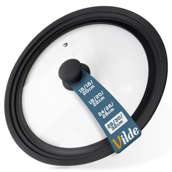 Pokrywka wykonana jest z hartowanego szkła odpornego na wysokie temperatury oraz z silikonu w czarnym kolorze, który doskonale dopasowuje się do naczyń i zabezpiecza brzegi przed uszkodzeniem.