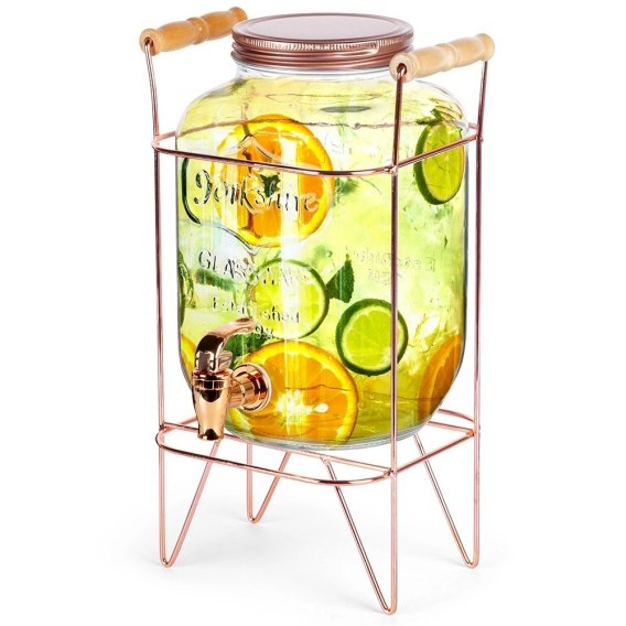 Zestaw składający się ze słoja z kranikiem oraz stojaka na słój. Idealny do serwowania wody, lemoniady, soku, herbaty mrożonej, wody smakowej, ale również ponczu. Dzięki kranikowi w łatwy sposób zaserwujemy ulubione napoje w sposób efektowny. Słój ze stojakiem wykorzystamy zarówno w ogrodzie, jak i podczas spotkań rodzinnych. Dzięki zamykanej pokrywie żadne owady nie dostaną się do naszego napoju. Wykonany jest z materiałów bezpiecznych dla zdrowia i neutralnych dla żywności. Nie nadaje się do napojów gorących. Uwaga! Na opakowaniu widnieje błędna informacja dot. pojemności, faktyczna pojemność jest zgodna z powyższym opisem.