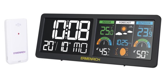 Ermenrich Report WR70 to wielofunkcyjna domowa stacja meteorologiczna, która zapewnia kompleksowe dane na temat warunków zewnętrznych, mikroklimatu wewnętrznego, fazy Księżyca i krótkoterminowej prognozy pogody. Urządzenie ma dwa ekrany z matrycą VA o wysokiej rozdzielczości. Na lewym ekranie wyświetlana jest godzina, data, miesiąc, dzień tygodnia i stan alarmu (włączony/wyłączony). Prawy ekran wyświetla temperaturę i wilgotność powietrza, trzypoziomowy wskaźnik komfortu, ciśnienie atmosferyczne i inne dane meteorologiczne.