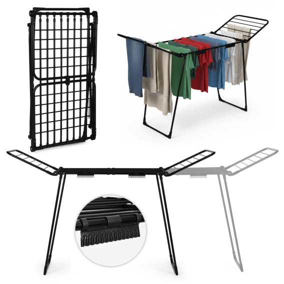 Suszarka została zaprojektowana z myślą o wygodnym przechowywaniu - jej składanie jest szybkie, intuicyjne i nie wymaga użycia siły. Po złożeniu zajmuje minimalną ilość miejsca, dzięki czemu bez problemu zmieści się w szafie, za drzwiami lub obok pralki. Dodatkowo zastosowano praktyczną blokadę skrzydeł, która zapobiega samoczynnemu rozkładaniu się konstrukcji, ułatwiając jej bezpieczne przenoszenie i przechowywanie.