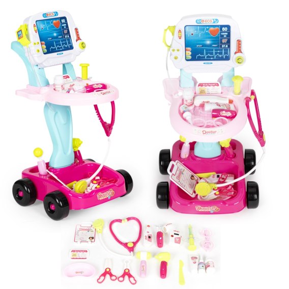 Zestaw lekarza, to wspaniała zabawka, która pozwala na wcielenie się w rolę doktora, co dostarczy wiele godzin zabawy rozwijając jednocześnie wyobraźnię i kreatywność. Ten wózek, to doskonały pomysł na prezent dla małych lekarzy i pielęgniarek, dzięki wielu akcesoriom, które można spotkać w prawdziwym gabinecie, zabawa stanie się jeszcze bardziej wciągająca. Efekty dźwiękowe jak np. rytm bicia serca i podświetlany termometr, czy pulsometr, przyciągną wszystkie dzieci na długie godziny dobrej zabawy.